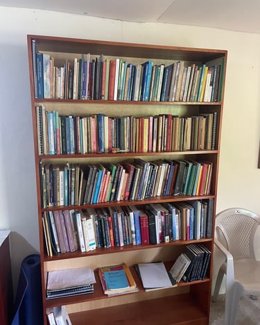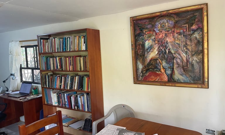 Por si acaso te preguntabas cómo he acondicionado mi casa, incluí algunas fotos. El pizarrón blanco es de una charla que di a algunas de las mujeres del proyecto de huertos. Las cuatro pinturas son del taller de pintura que tomé aquí en Vilcabamba. Tal vez no sean muy talentosas, pero representan el agua, el aire, el fuego y el éter. El taller fue muy divertido.